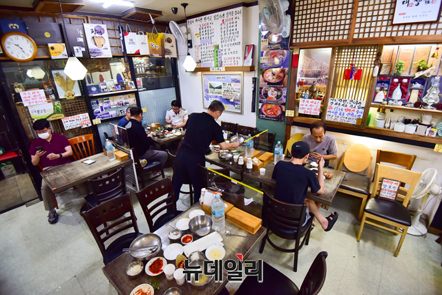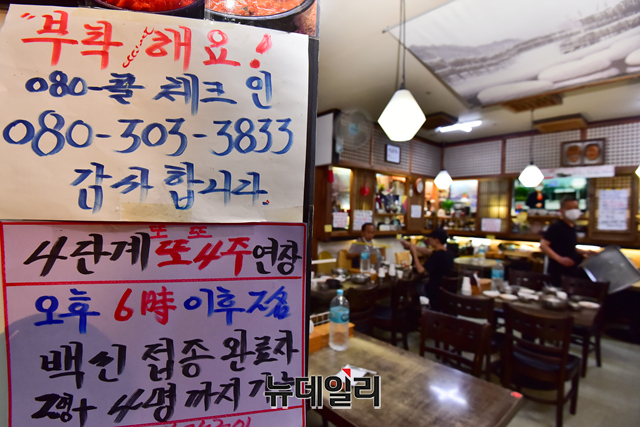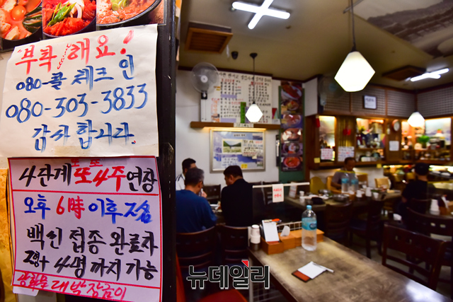 음식점 운영자가 25일 오후 서울 종로구 한 식당 출입구에서 백신 인셉티브 관련 문구가 적힌 안내문을 부착하고 있다.24일부터 코로나19 백신 접종 완료자는 코로나19 변이 바이러스 확진자와 밀접접촉을 해도 증상이 없으면 자가 격리 의무가 면제된다.수도권 등 사회적 거리두기 4단계 지역은 식당과 카페, 가정에서는 오후 6시 이후 접종 완료자를 포함해 총 6명까지 사적 모임이 가능하다. 접종을 마치지 않은 시민은 오후 6시 이전 4명, 이후에는 최대 2명까지만 모임 가능하다. 사회적 거리두기 4단계는 10월 3일까지 적용된다.
