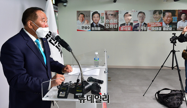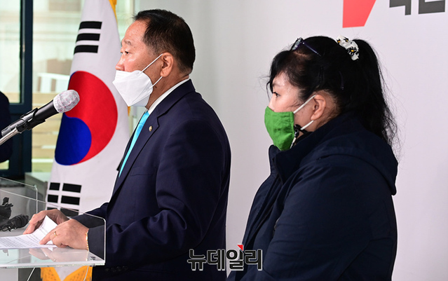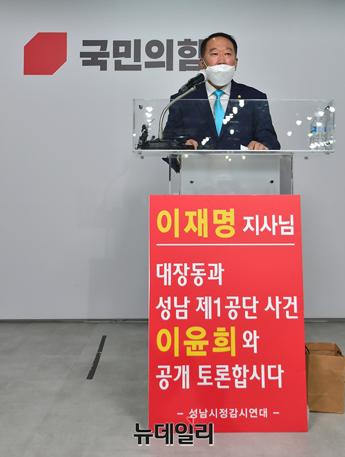 이윤희 성남시정감시연대 대표가 28일 오전 서울 여의도 국민의힘 당사에서 대장동 개발사업 의혹과 관련해 "이재명 경기지사 심복인 유동규 전 성남도시개발공사 기획본부장(사장직무대리), 정진상 전 경기도 정책실장이 대장동 개발사업 핵심 업무를 총괄했다"며 특별검사 등의 수사를 촉구하는 기자회견을 갖고 있다.