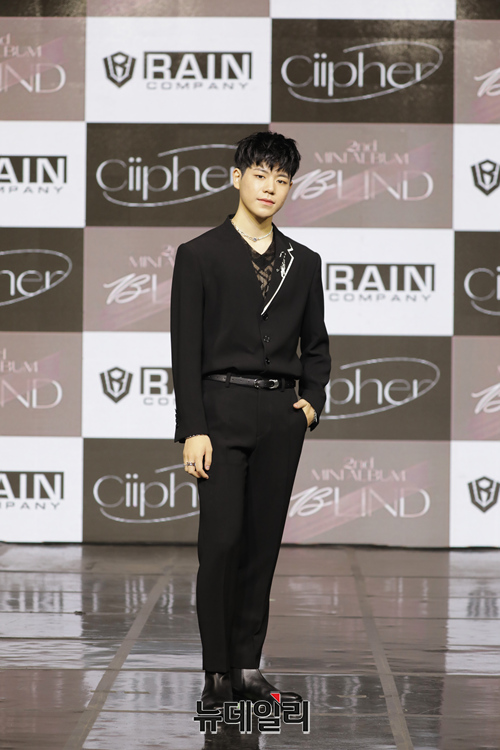 아이돌그룹 싸이퍼(Ciipher) 멤버 도환이 28일 오후 온라인으로 열린 두 번째 미니앨범 'BLIND'(블라인드)' 발매 기념 쇼케이스에서 포토타임을 갖고 있다.