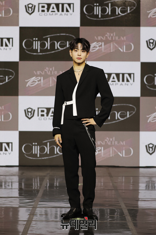 아이돌그룹 싸이퍼(Ciipher) 멤버 케이타가 28일 오후 온라인으로 열린 두 번째 미니앨범 'BLIND'(블라인드)' 발매 기념 쇼케이스에서 포토타임을 갖고 있다.