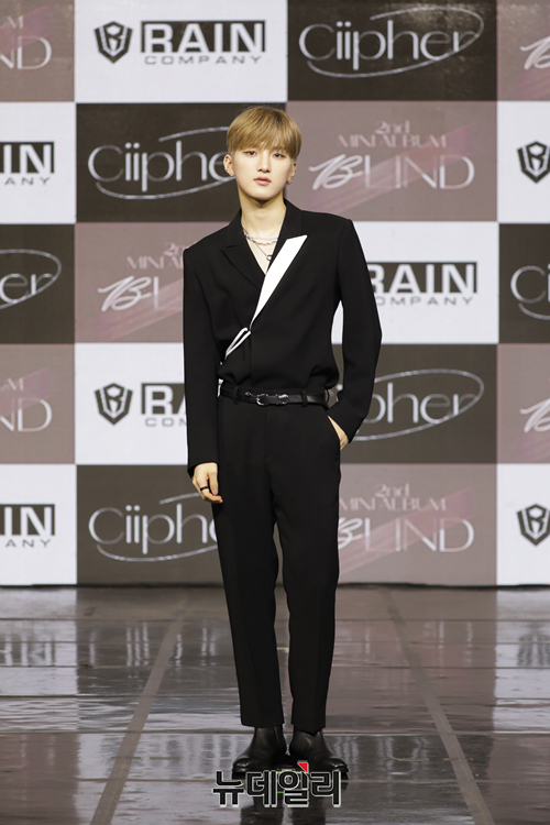 아이돌그룹 싸이퍼(Ciipher) 멤버 현빈이 28일 오후 온라인으로 열린 두 번째 미니앨범 'BLIND'(블라인드)' 발매 기념 쇼케이스에서 포토타임을 갖고 있다.