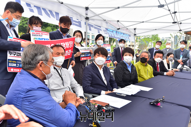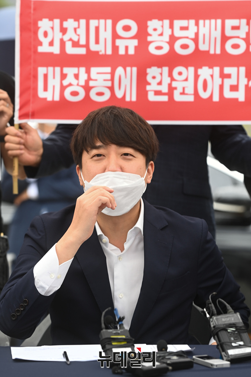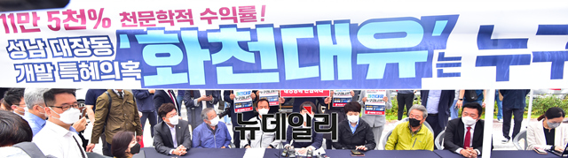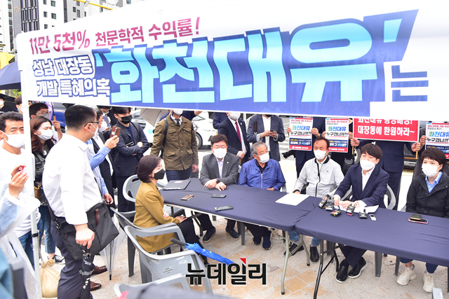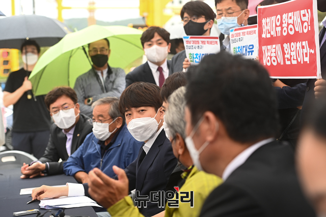 이준석 국민의힘 대표(중앙)와 김은혜 국민의힘 의원이 29일 오전 경기 성남시 대장동 일대에서 판교대장동 개발 특혜 의혹 진상조사를 위해 원주민들과 간담회를 갖고 있다. (경기 성남=강민석 기자)
