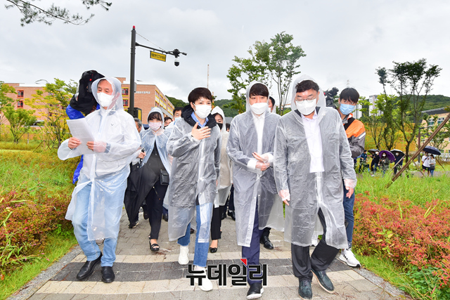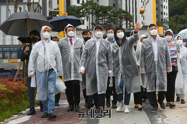 이준석 국민의힘 대표가 29일 오전 경기 성남시 대장동 일대에서 판교대장동 개발 특혜 의혹 진상조사를 위해 현장을 둘러보고 있다. (경기 성남=강민석 기자)
