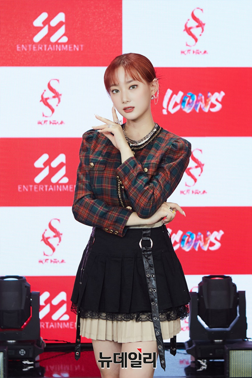 걸그룹 핫이슈(HOT ISSUE) 멤버 나현이 29일 오후 온라인으로 진행된 새 앨범 '아이콘스(ICONS)' 발매 기념 쇼케이스에서 포즈를 취하고 있다.