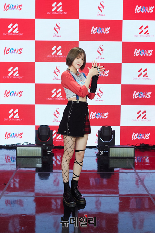 걸그룹 핫이슈(HOT ISSUE) 멤버 메이나가 29일 오후 온라인으로 진행된 새 앨범 '아이콘스(ICONS)' 발매기념 쇼케이스에서 포즈를 취하고 있다.
