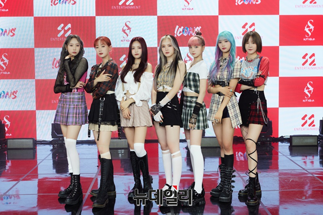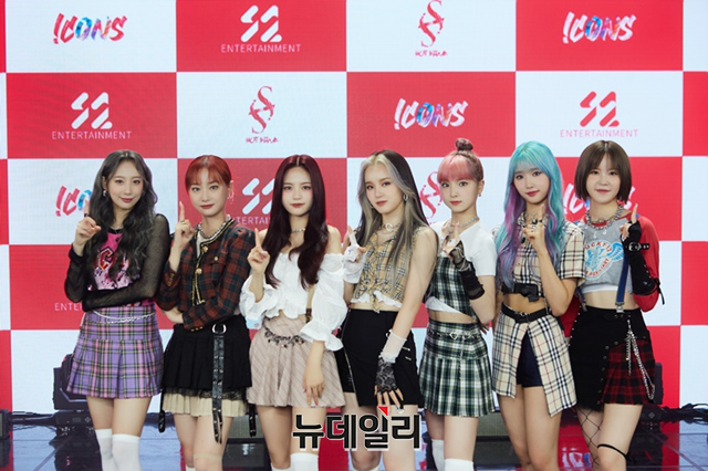 걸그룹 핫이슈(왼쪽부터 예원, 나현, 다나, 형신, 다인, 예빈, 메이나)가 29일 오후 온라인으로 진행된 새 앨범 '아이콘스(ICONS)' 발매기념 쇼케이스에서 포즈를 취하고 있다.