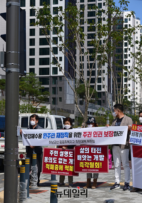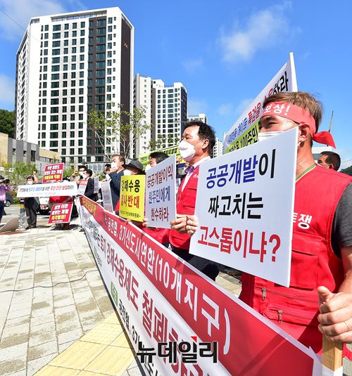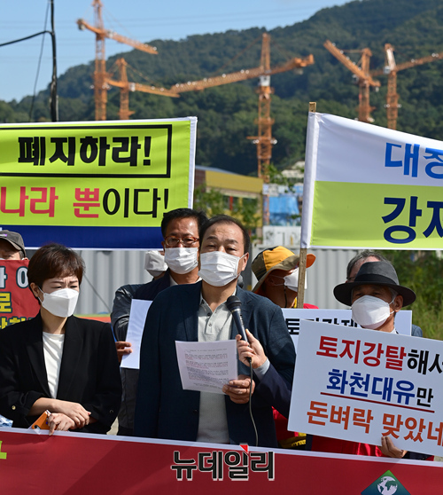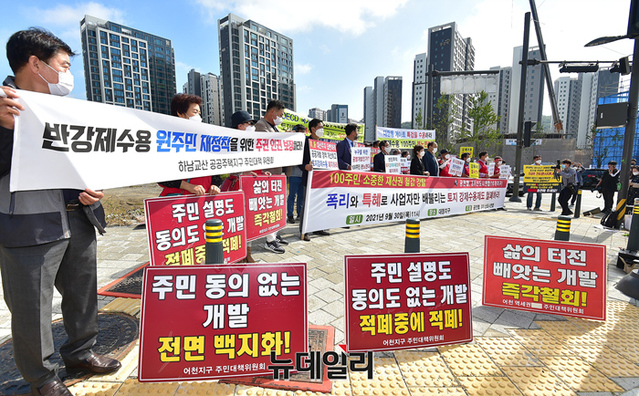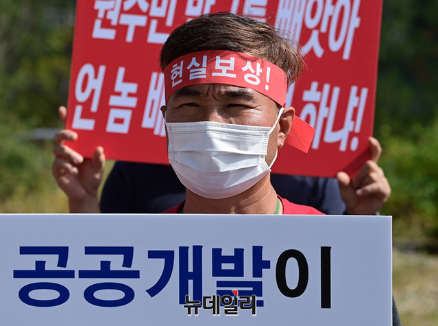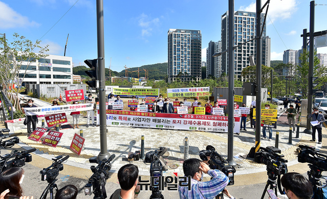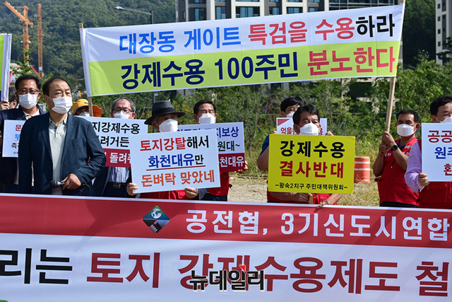 공공주택지구 전국연대 대책협의회(공전협)이 30일 오전 경기 성남시 판교 대장동에서 대장동게이트 규탄 기자회견을 열고, 강제수용제도 철폐와 토지보상법 개정, 대장동 게이트 특검 수용 등을 촉구했다. (경기 성남=정상윤 기자)