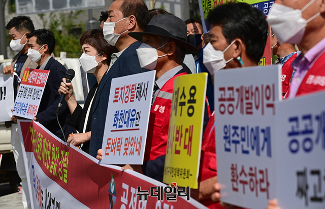 공전협과 3기신도시연합은 이날 기자회견을 열고 강제수용제도 철폐, 토지보상법 개정, 대장동 게이트 특검 수용 등을 촉구했다. (경기 성남=정상윤 기자)