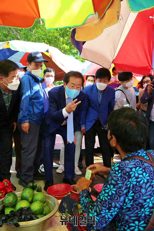 대구지역을 방문중인 홍준표 국민의힘 대선 예비후보가 30일 오후 대구 북구 칠성시장을 방문해 상인과 인사를 나누고 있다. (사진=홍준표 캠프)