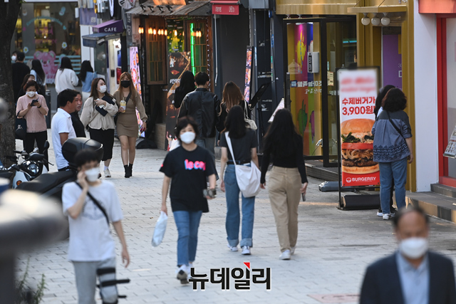 정부가 사회적 거리두기 조정안 발표를 하루 앞둔 30일 오후 서울 마포구 홍대거리 일대에서 시민들이 지나가고 있다.방역당국에 따르면 1일 발표 되는 조정안에는 사적모임 인원, 영업제한 등과 관한 세부적인 방역수칙이 다소 조정될 것으로 전망했다. 또 사회적 거리두기 발표 내용에 '백신패스' 도입은 포함되지 않는다고 밝혔다.백신 패스는 독일과 프랑스, 덴마크 등 해외국가에서 백신 접종자에 다중이용시설 이용 제한을 완화하고, 미접종자는 PCR 음성확인서가 있어야만 이용할 수 있도록 하는 조치다.