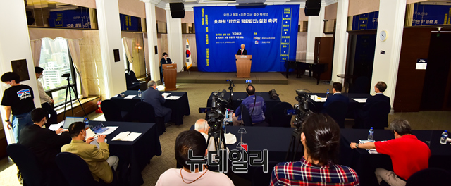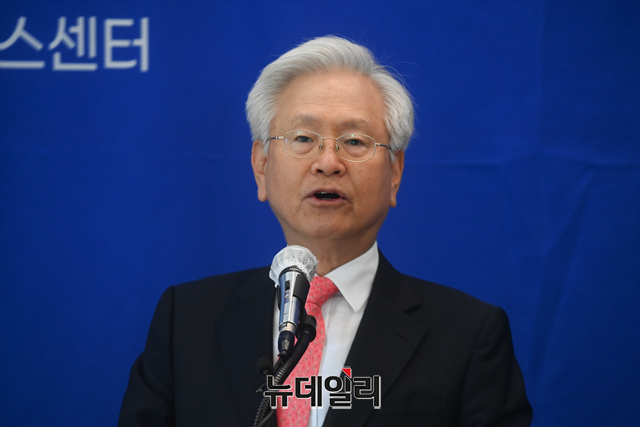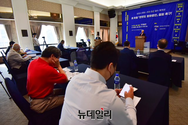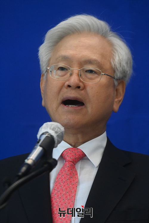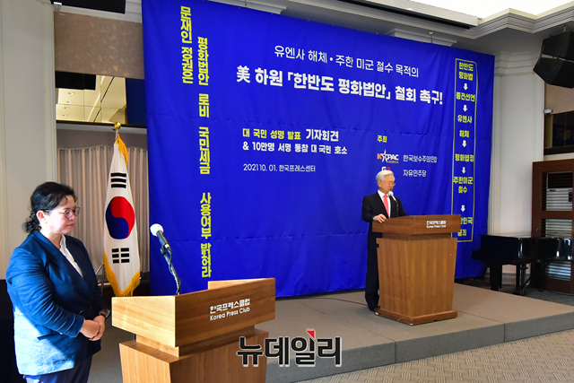 고영주 한국보수주의연합(KCPAC) 공동의장이 1일 오전 서울 중구 한국프레스센터에서 한국보수주의연합과 자유민주당의 공동 주최로 열린 '한반도 평화법' 철회 촉구 및 '미국내 친북조직의 하원의원 포섭 활동' 공개 긴급 기자회견에서 유엔사 해체와 주한 미군 철수를 목적으로 한 미국 하원의 한반도 평화법안 철회 촉구 및 성명 등을 주제로 발표하고 있다.