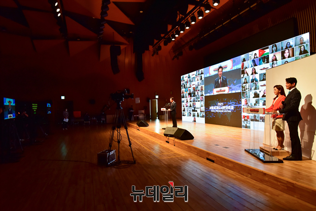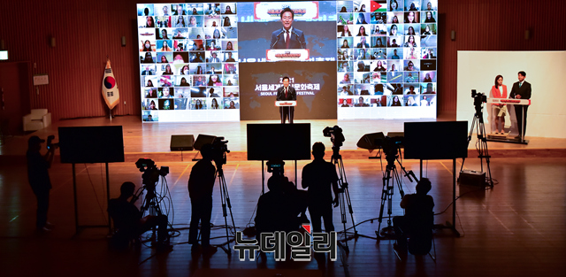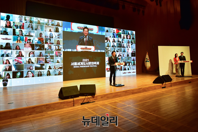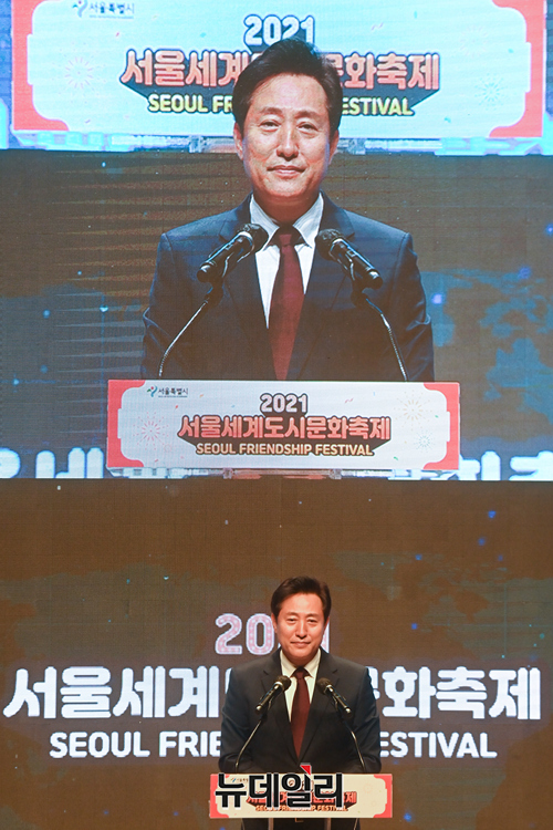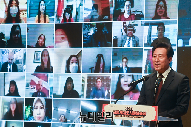 오세훈 서울시장이 1일 오전 서울 중구 서울시청 다목적홀에서 열린 2021 서울세계도시문화축제 온라인 개막식에서 환영사를 하고 있다.'2021서울세계도시문화축제'는 55개국 주한 외국대사관과 해외도시가 참여한다. 세계 각국의 집밥 소개, 주한외국대사관이 선정한 서울의 맛집과 멋집 소개, 해외친선우호도시 공연영상 등 다채로운 10개의 프로그램을 선보인다.'집콕! 서울에서 즐기는 세계도시 문화'를 주제로 1일부터 10일까지 온라인으로 진행된다.