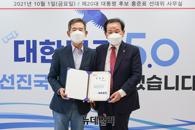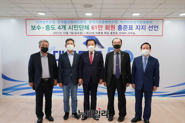 보수 및 중도 성향 4개 시민단체 대표가 1일 서울 여의도 홍준표캠프에서 홍준표 예비후보 지지 선언을 갖고 기념촬영을 하고 있다. 이날 지지선언을 한 시민단체는 △미래행복포럼(총재 석종현) △한국출산행복진흥원(이사장 김양옥) △한국사회문화연구원(이사장 홍사광) △역사바로알기운동본부(상임고문 김도윤) 등 4개 단체다. (사진=홍준표 캠프)