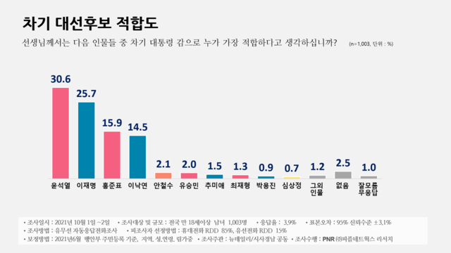 뉴데일리와 시사경남 의뢰로 여론조사업체 PNR(피플네트웍스리서치)가 지난 지난 1~2일 이틀간 전국 유권자 1003명을 대상으로 차기 대통령 적합도를 조사한 결과, 윤석열 후보가 30.6%로 1위를 기록했다.