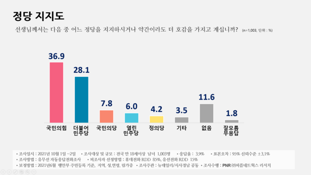 정당 지지도, 국민의힘 36.9% vs 민주당 28.1%