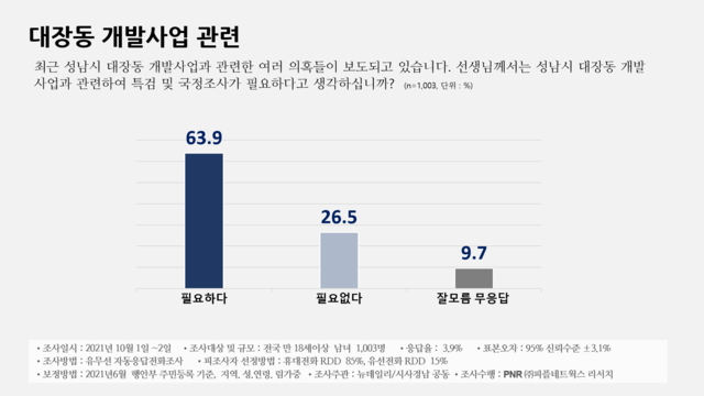 뉴데일리와 시사경남 의뢰로 여론조사업체 PNR(피플네트웍스리서치)가 지난 1~2일 이틀 동안 전국 유권자 1003명을 대상으로 조사한 결과 '화천대유' 의혹과 관련한 특검 또는 국정조사가 필요하다고 응답한 비율은 63.9%였다. '필요없다'는 응답자는 26.5%에 그쳤다. '잘모름'과 '무응답'은 9.7%였다.