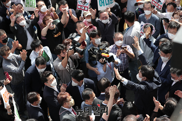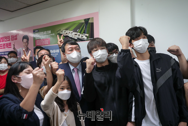 윤석열 국민의힘 대선 예비후보가 4일 오전 부산 사상구 당협위원회 인근에서 지지자가 준비한 꽃다발을 받고 있다. (사진=윤석열 캠프)