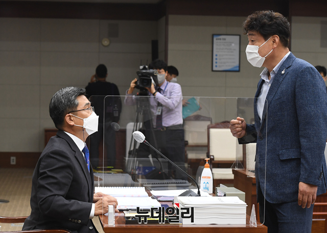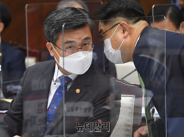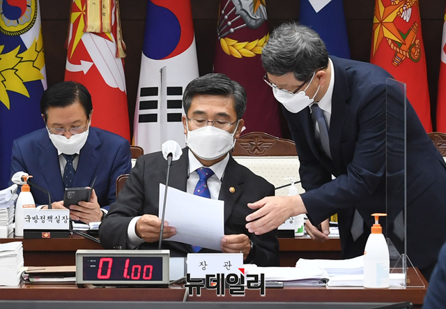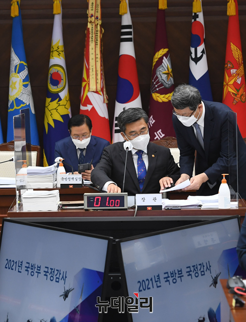 서욱 국방부 장관이 5일 오전 서울 용산구 국방부에서 진행된 국회 국방위원회 국정감사에서 서류를 살펴보고 있다. 국정감사는 국민의힘 위원들이 대장동 특혜 의혹에 대한 특검요구에 개의되지 못하고 있다. (사진=공동취재단)