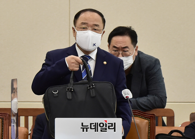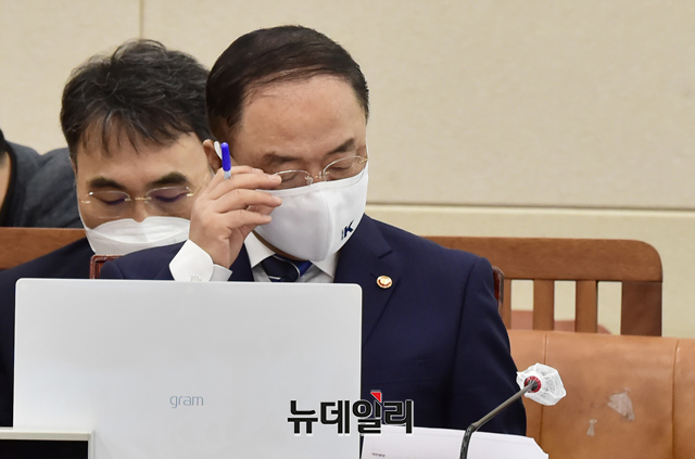 홍남기 경제부총리가 5일 서울 여의도 국회에서 열린 국회 기획재정위원회, 2021년도 기획재정부(경제·재정정책) 국정감사에 출석해 앉아 있다. (사진=공동취재단)