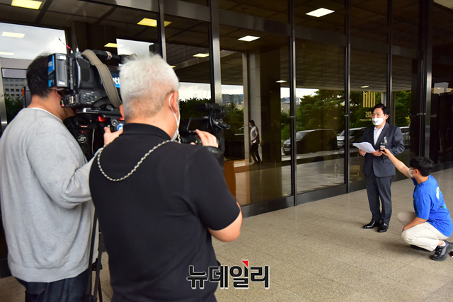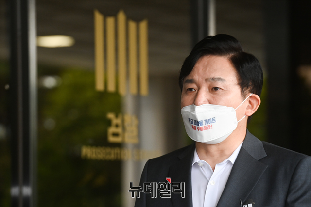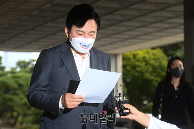 원희룡 국민의힘 대선 예비후보(왼쪽)가 5일 오전 서울 서초구 서울중앙지방검찰청을 방문해 '대장동 게이트'의 엄정한 수사를 촉구하며 입장을 밝히고 있다. 원 후보는 대리인을 통해 서한을 검찰에 전달했다.