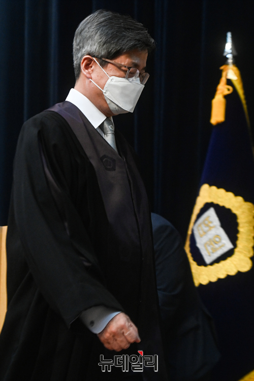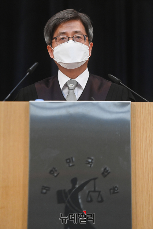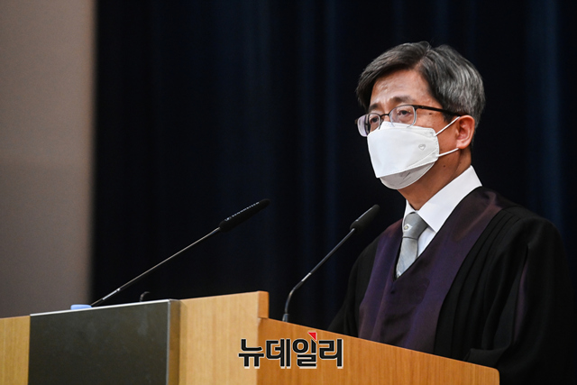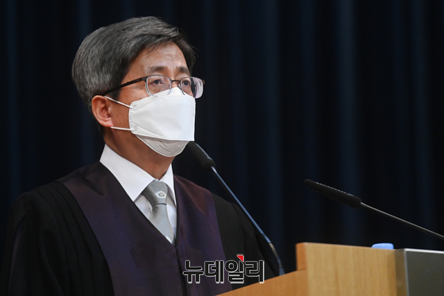 김명수 대법원장이 5일 오후 서울 서초구 대법원 대강당에서 진행된 신임법관 임명식에서 임명식사를 하고 있다.