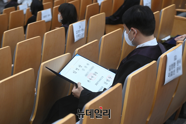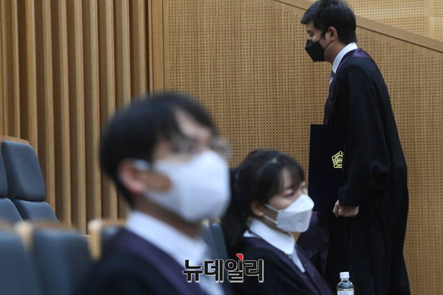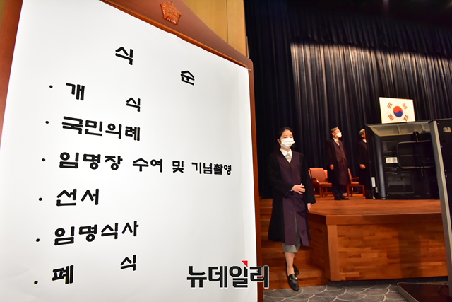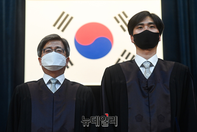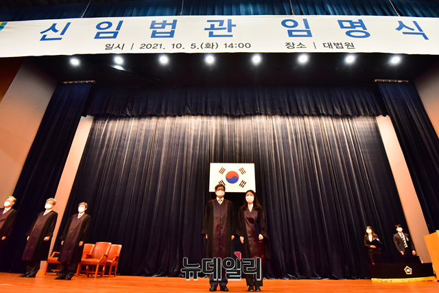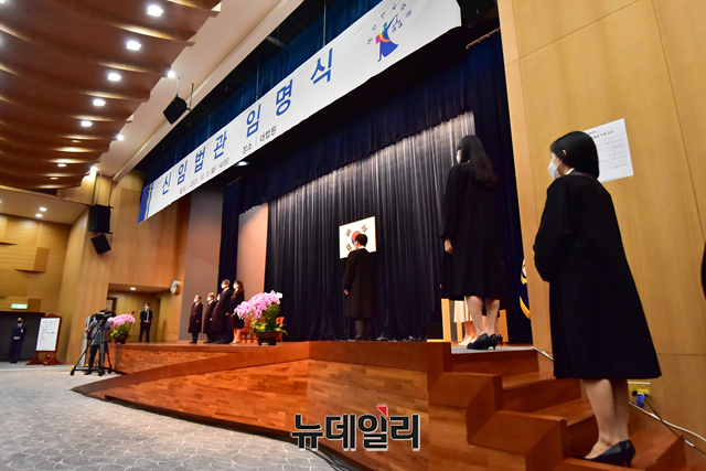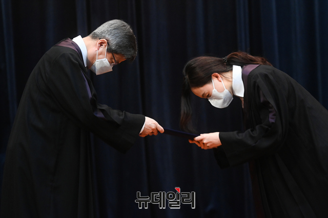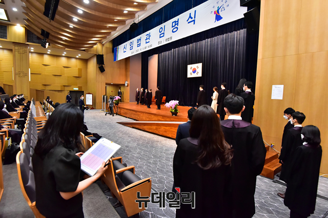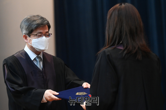 김명수 대법원장이 5일 오후 서울 서초구 대법원 대강당에서 진행된 신임법관 임명식에서 신임법관에게 임명장을 수여하고 있다.