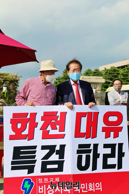 [포토] 화천대유 특검 촉구 1인시위하는 이재오 전 장관 찾은 홍준표