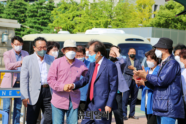홍준표 국민의힘 대선 예비후보가 5일 오후 서울 여의도 국회의사당 정문 앞에서 화천대유 특검을 촉구하며 1인 시위 중인 이재오 전 장관을 격려 방문하고 있다. (사진=홍준표 캠프)