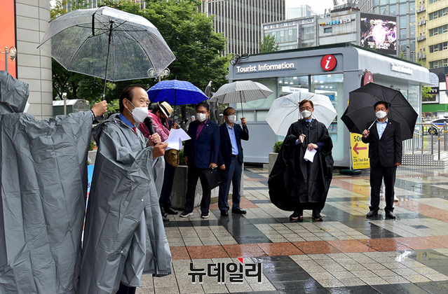 최재형 국민의힘 대선 예비후보와 장기표 전 후보가 6일 오전 서울 종로구 동화면세점 앞에서 대장동 게이트 규탄 1인시위 직전 대화를 나누고 있다.