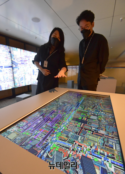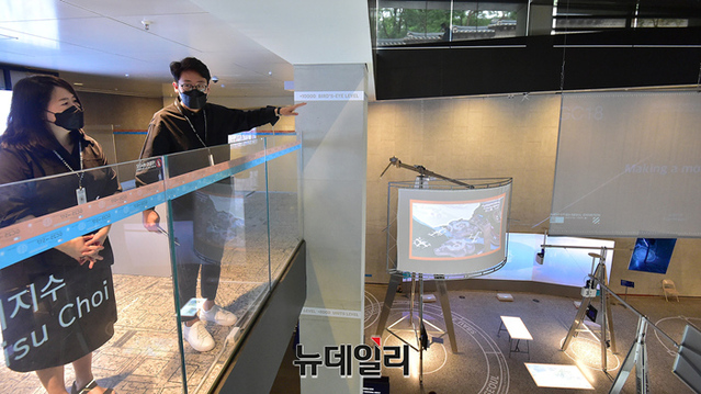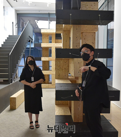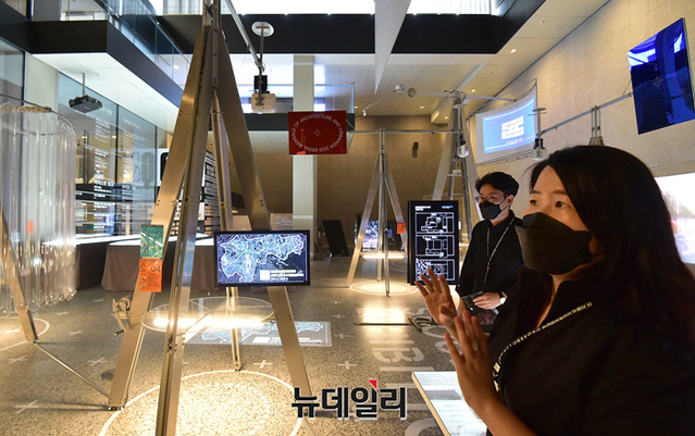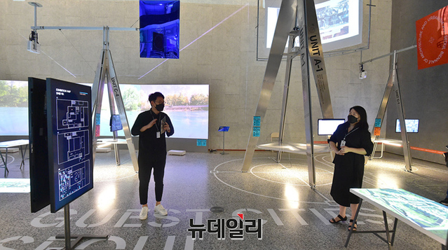 전진홍, 최윤희 2021 서울도시건축비엔날레 서울전 큐레이터가 6일 오후 서울 중구 서울도시건축전시관에서 팸투어를 진행하며 작품을 소개하고 있다.