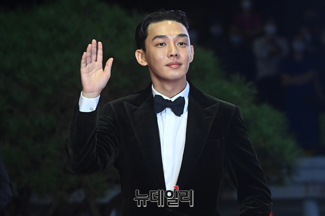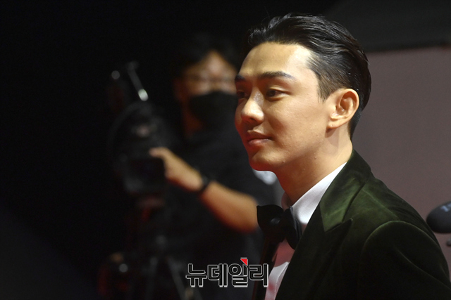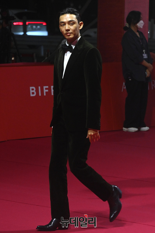 배우 유아인이 6일 오후 부산 해운대구 영화의전당에서 개막한 2021 부산국제영화제(BIFF) 레드카펫에서 이동하고 하고 있다.