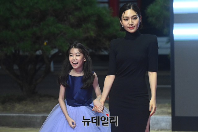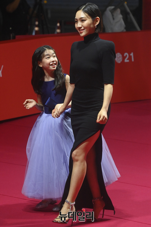 아역 배우 박소이, 배우 최희서가 6일 오후 부산 해운대구 영화의전당에서 개막한 2021 부산국제영화제(BIFF) 레드카펫에서 포즈를 취하고 있다.