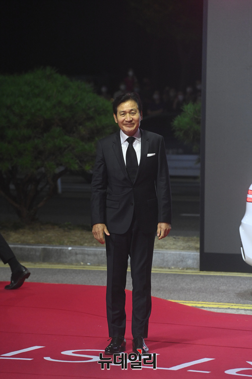배우 안성기가 6일 오후 부산 해운대구 영화의전당에서 개막한 2021 부산국제영화제(BIFF) 레드카펫에서 포즈를 취하고 있다.