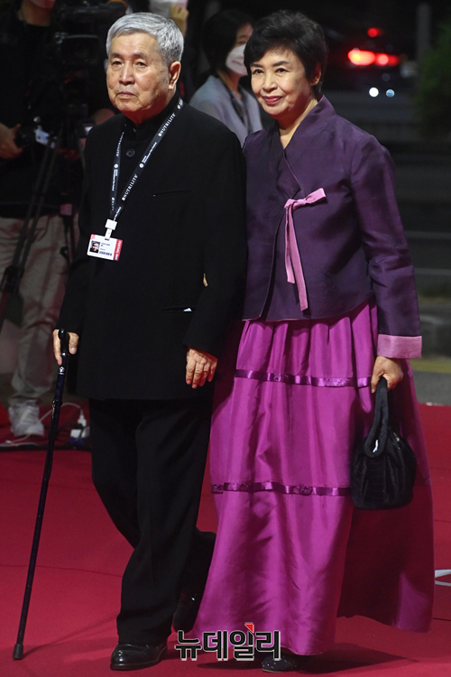 감독 임권택(왼쪽), 채령 부부가 6일 오후 부산 해운대구 영화의전당에서 개막한 2021 부산국제영화제(BIFF) 레드카펫에서 이동하고 있다.