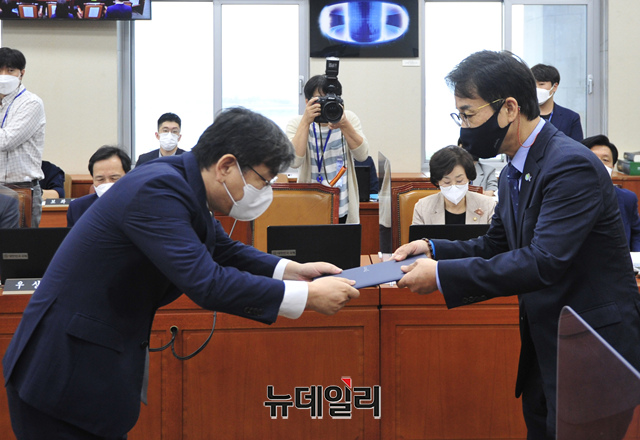 엄재식 원자력안전위원회 위원장이 7일 오전 국회에서 열린 과학기술정보방송통신위원회 2021년도 원자력안전위원회, 한국원자력안전기술원 등에 대한 국정감사에 출석해 선서를 하고 있다. (사진=공동취재단)