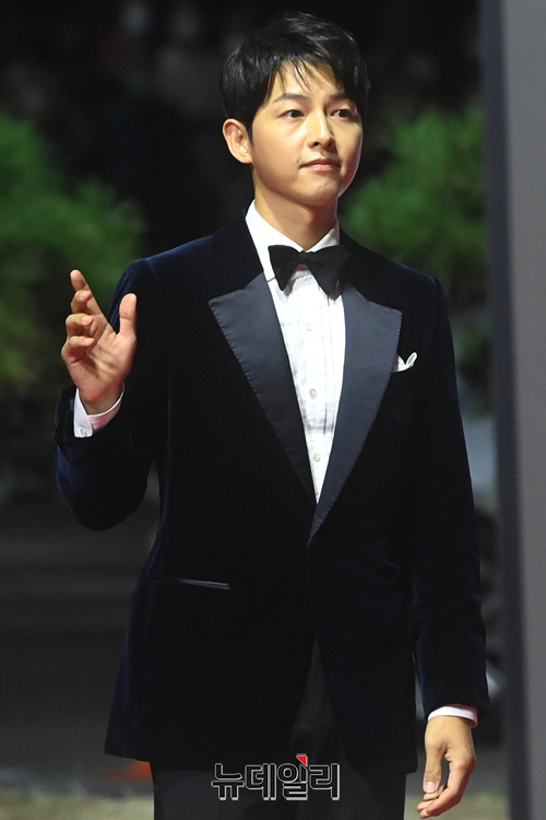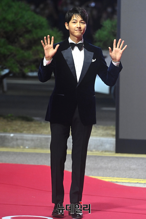 배우 송중기가 6일 오후 부산 해운대구 영화의전당에서 개막한 2021 부산국제영화제(BIFF) 레드카펫에서 포즈를 취하고 있다.