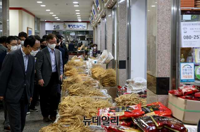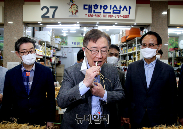 최재형 국민의힘 대선 경선 예비후보가 7일 오전 경북 영주시 풍기인삼시장에서 인삼을 들고 있다. (사진=최재형 캠프)