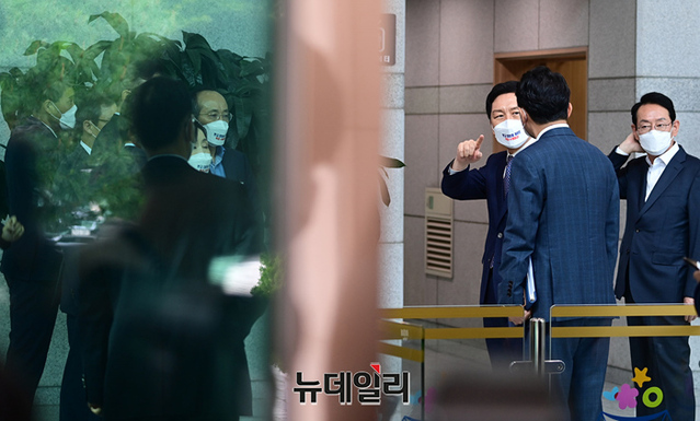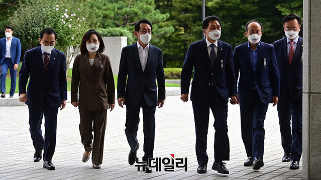 김기현 국민의힘 원내대표가 7일 오후 서울 서초구 대검찰청으로 판교 대장동 게이트 수사를 촉구하며 항의방문을 하고 있다. 이날 항의 방문에는 김 원내대표를 비롯해 김도읍, 전주혜, 추경호, 유상범, 태영호 의원이 참석했다.