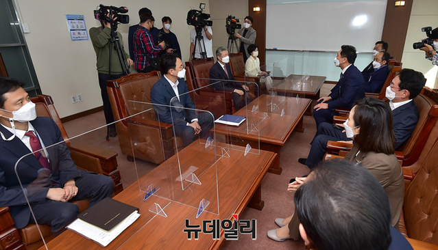 김기현 국민의힘 원내대표가 7일 오후 서울 서초구 대검찰청으로 판교 대장동 게이트 수사와 관련해 항의 방문해 박성진 대검 차장 검사와 면담을 갖고 있다. 이날 항의 방문에는 김 원내대표를 비롯해 김도읍, 전주혜, 추경호, 유상범, 태영호 의원이 참석했다.