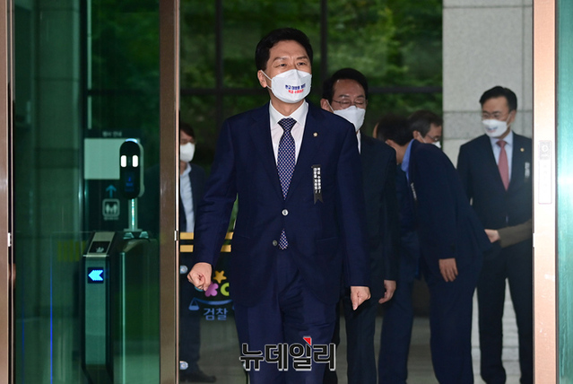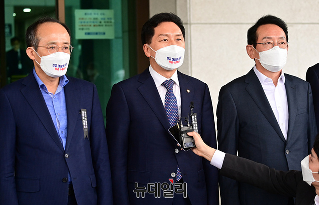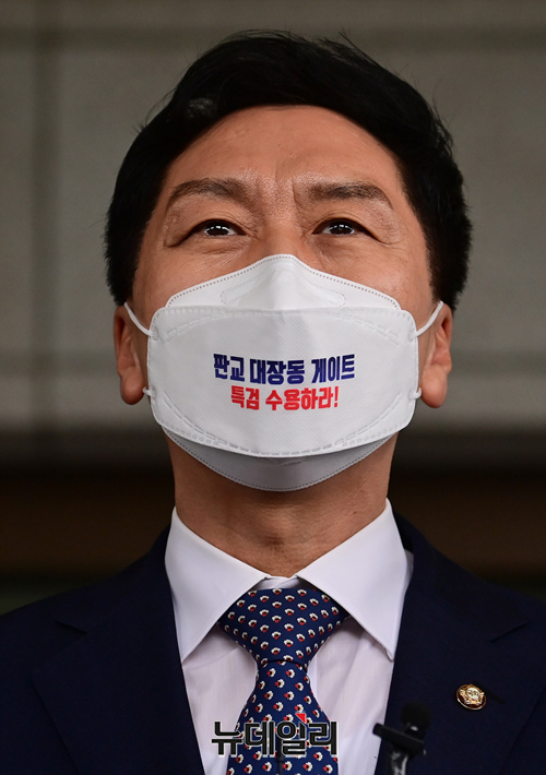 김기현 국민의힘 원내대표가 7일 오후 서울 서초구 대검찰청으로 판교 대장동 게이트 수사를 촉구하는 항의 방문을 마치고 발언하고 있다. 김 대표가 착용한 보건용 마스크에는 '대장동 게이트 특검을 수용하라'는 문구가 적혀있다. 항의 방문에는 김 원내대표를 비롯해 김도읍, 전주혜, 추경호, 유상범, 태영호 의원이 참석했다.