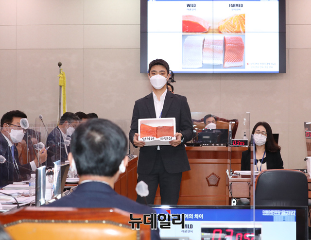 윤재갑 더불어민주당 의원이 7일 국회 농림축산식품해양수산위원회 해양수산부 국정감사에서 문성혁 해수부 장관에게 보좌관이 든 양식과 자연산 연어의 차이에 대해 질의하고 있다. (사진=공동취재단)
