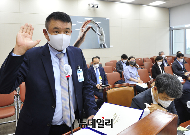 박기문 STX엔진 대표가 7일 오후 국회에서 열린 과학기술정보방송통신위원회 2021년도 원자력안전위원회, 한국원자력안전기술원 등에 대한 국정감사에 출석해 증인선서를 하고 있다. (사진=공동취재단)