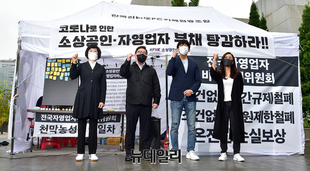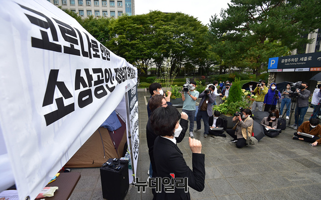 전국자영업자비상대책위원회가 8일 오전 서울 종로구 정부서울청사 앞에 설치한 천막 농성장에서 입장발표를 하고 있다.