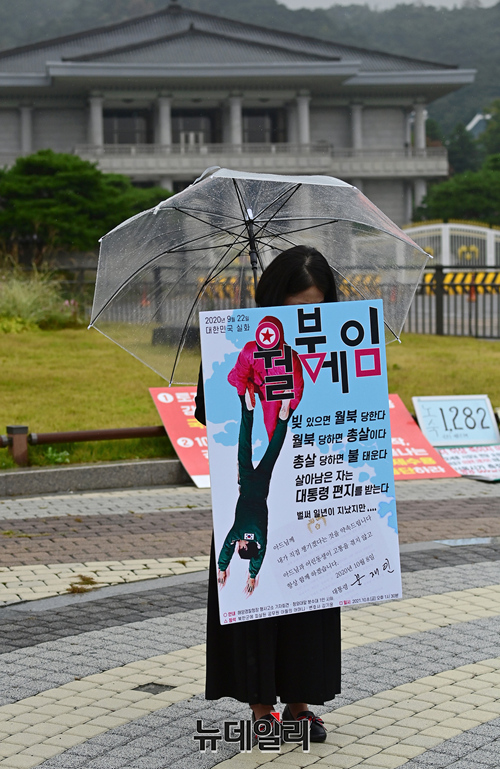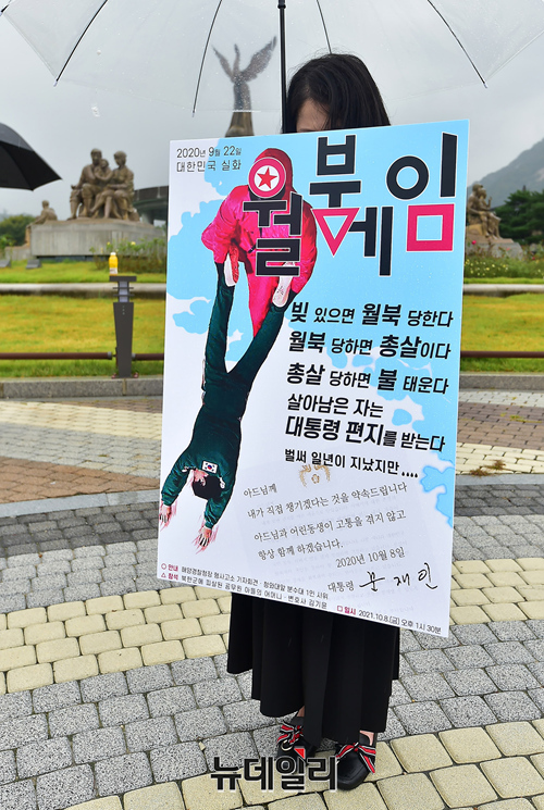 북한의 총격으로 사망한 해양수산부 공무원의 유족이 8일 오후 청와대 분수대 앞에서 1인시위에 돌입했다.