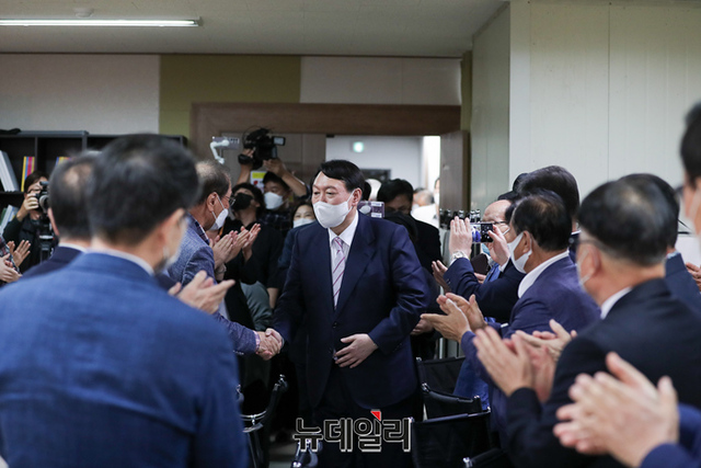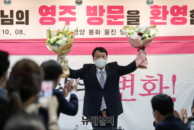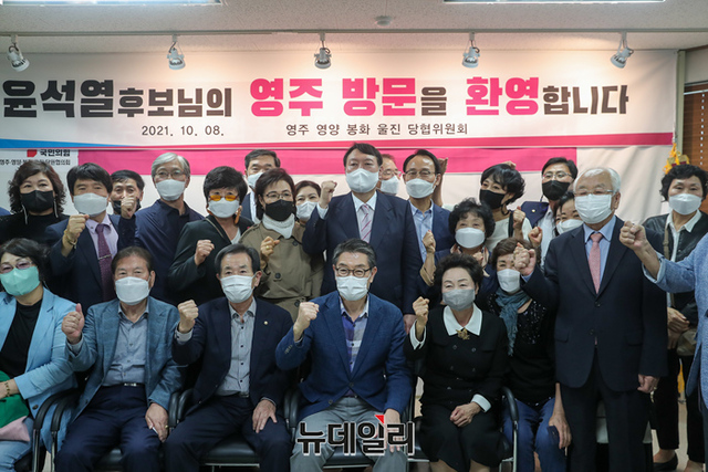 윤석열 국민의힘 대선 예비후보가 8일 오후 경북 영주시 당협사무실을 방문해 영주시 당원들과 기념촬영을 하고 있다. (사진=윤석열 캠프)