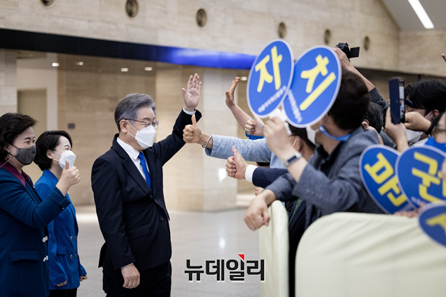 이재명 더불어민주당 대선 경선 후보가 9일 오후 경기도 수원시 영통구 수원컨벤션센터에서 열린 더불어민주당 제20대 대통령선거 후보자 선출을 위한 경기 합동연설회에서 지지자들과 인사를 나누고 있다. (사진=이재명 캠프)