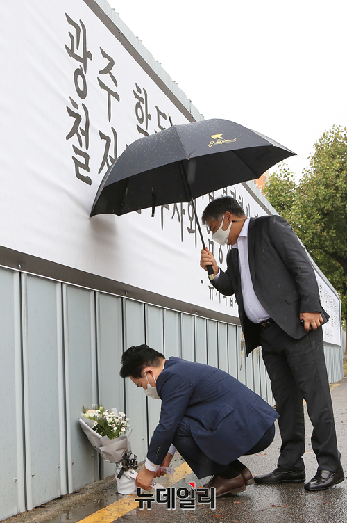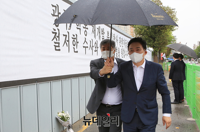 원희룡 국민의힘 대선 예비후보가 11일 오전 광주 동구 학동 붕괴참사 현장 앞을 찾아 헌화하고 묵념하고 있다. (사진=원희룡 캠프)