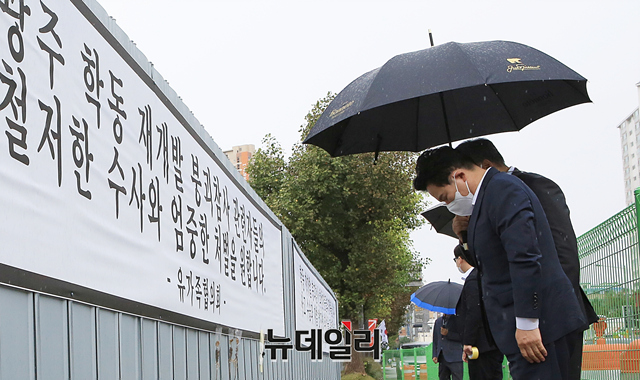 [포토] 광주 학동붕괴참사 현장서 묵념하는 원희룡 후보