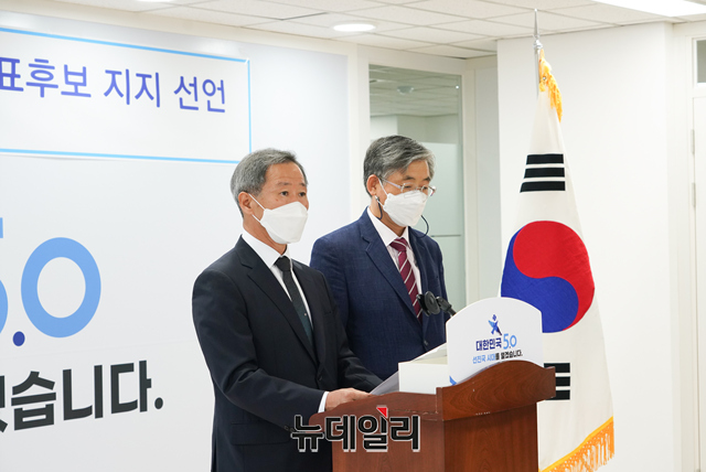 장재환 국방안보위원회 위원장(오른쪽)과 조경태 국민의힘 의원이 8일 오전 서울 여의도 홍준표 선거캠프에서 열린 육군·해군·해병대 장성단 홍 후보 지지선언에서 임명장을 들고 기념촬영을 하고 있다. (사진=홍준표 캠프)