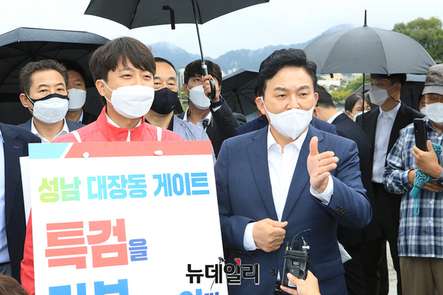 이준석 국민의힘 대표가 11일 오후 광주 동구 옛전남도청 앞에서 대장동 게이트 특검을 촉구하는 1인시위를 하고 있다. (사진=원희룡 캠프)